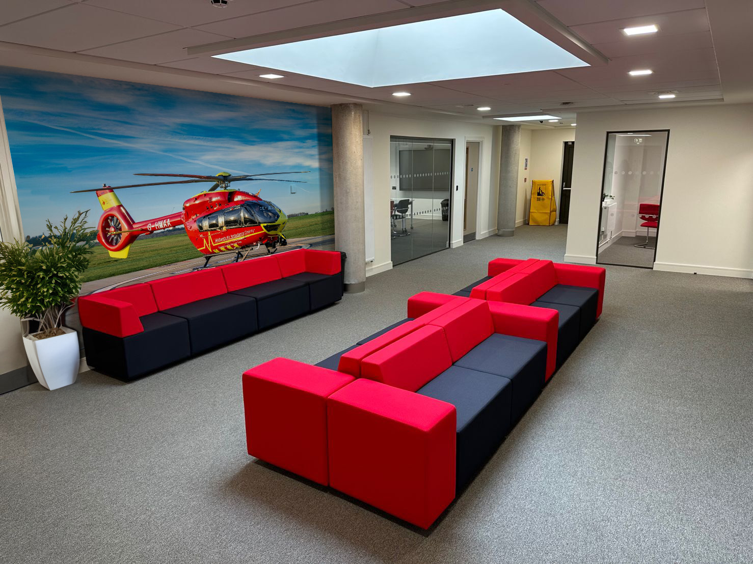 The brief covered all key areas of the new facility, including workspaces for various departments, management offices, meeting rooms, and specialised training areas. In addition, the design had to incorporate branding elements and create a welcoming atmosphere for visitors, partners, and donors. The new site would also feature breakout spaces and staff welfare areas, supporting employee well-being and collaboration. The comprehensive design approach ensured that the new headquarters provided a modern, efficient, and inspiring space for the Midlands Air Ambulance Charity’s growing operation.
